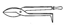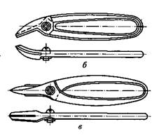 Такие ножницы (рисунок 4, а) предназначены для разрезания материала по прямой линии или по дуге большого радиуса. Если требуется вырезать в листовом материале отверстие или вырезать деталь по контуру с малыми радиусами кривизны, применяют ножницы с криволинейными лезвиями (рисунок 4, б) или пальцевые ножницы с тонкими и узкими режущими лезвиями (рисунок 4, в).