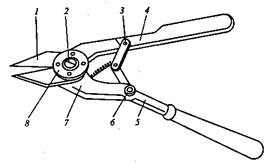 1 – нож; 2 – винт; 3 – шарнирное звено; 4 – рукоятка с насечкой; 5 - рукоятка с пластмассовым наконечником; 6 – ось; 7 – рычаг; 8 – шайба