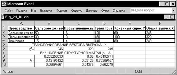 Рис. 24.1. Рабочий лист Excel – начальная часть модели межотраслевого баланса