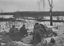 Расчёт 45-мм противотанковой пушки 53-К на окраине деревни под Москвой, ноябрь — декабрь 1941 года