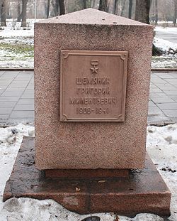 Алма-Ата, парк имени 28 гвардейцев-панфиловцев. Памятный камень, посвящённый Григорию Шемякину, родившемуся в 1906 (по старому стилю) или в 1907 (по новому стилю) году и фактически умершему в 1973 году, но на камне выгравирован год смерти как 1941, так как, по официальной версии, все 28 панфиловцев погибли.