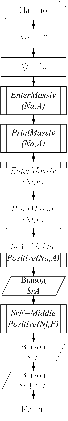 Для объявления массивов A и F опишем в разделе Type тип массива из 30 вещественных чисел. Для обозначения количества элементов массива A введем переменную Na, количества элементов массива F – переменную Nf, средних арифметических значений положительных элементов массивов – переменные SrA и SrF.