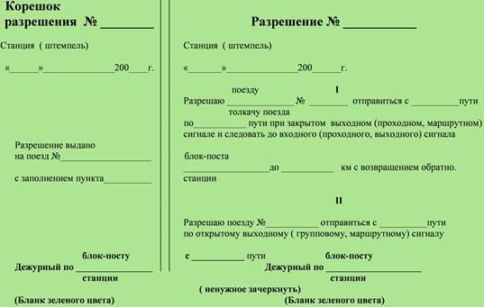 Приказ №…время…(час, мин). Разрешаю поезду (…номер) отправиться с (…номер) пути по (…номер) главному пути и следовать до станции (блок-поста) …Перегон свободен. ДСП…(фамилия).