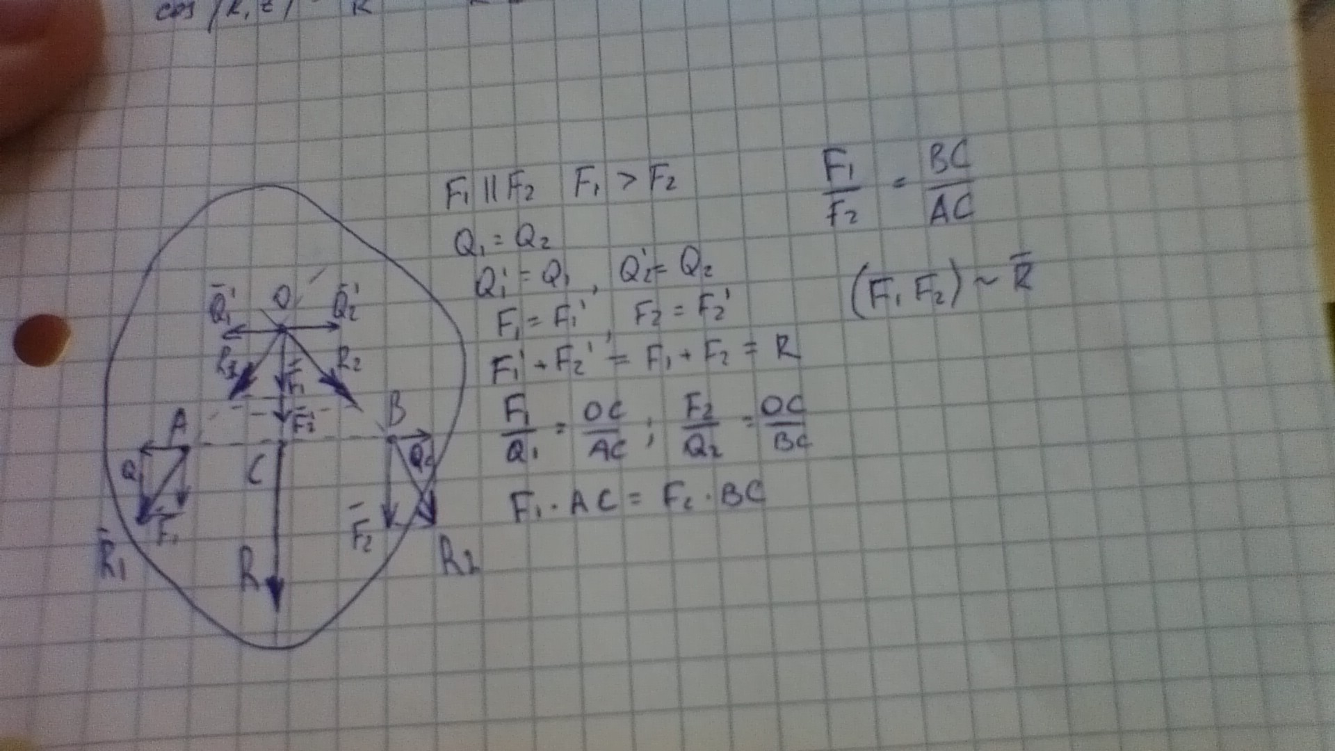 Система двух параллельных сил, направленных в одну сторону и не равных по величине имеет равнодействующую, параллельную этим силам, причем е емодуль равен сумме модулей слогаемых сил; линия действия равнодейстующей делит расстояние между точками приложения слогаемых сил внутренним образом на части обратно пропорциональные модулям этих сил.