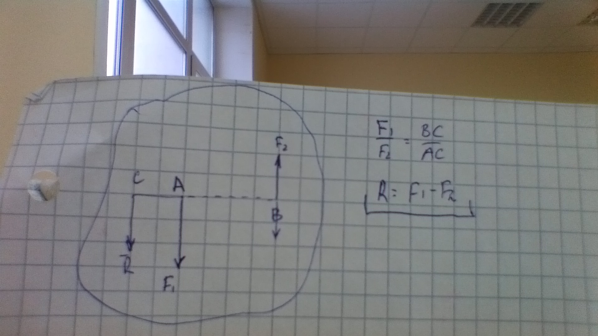 Если две не равные по модулю противоположно направленные, параллельные силы имеют равнодействующую параллельную этим силам, причем ее модуль равен разности модулей между большей и меньшей силами, линия действия равнодействующей делит расстояние между точками приложения слогаемых сил внешним образом на части обратно пропорциональные модулям этих сил.