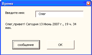 Программа-пример должна будет открывать на экране новое окно с показанным в нем приветствием, а также датой и временем (сообщением). Окно будет оставаться на экране до тех пор, пока пользователь не щелкнет на кнопке ОК.