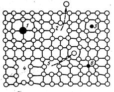 Рис.7. Схема точечных дефектов в кристалле: 1-примесный атом замещения, 2- дефект Шоттки, 3- примесный атом внедрения, 4- дивакансия, 5- дефект Френкеля (вакансия и межузельный атом), 6- примесный атом замещения.