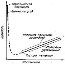 Достигнув минимального значения при некоторой плотности дислокаций, реальная прочность возрастает. Такого рода зависимость между реальной прочностью и плотностью дислокаций (и других несовершенств) схематически показана на рис.9.