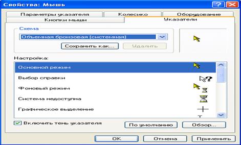 4. В появившемся окне Свойства: Мышь (рис. 2.5) установите схему для отображения указателя мыши - объёмная бронзовая (системная).