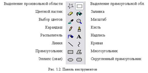 2. Изучите вид окна Paint.(рис.1.1.) Рассмотрите кнопки на Панели инструментов.(рис.1.2.) Если панель инструментов отсутствует на экране, то откройте её командой Вид – Набор инструментов.