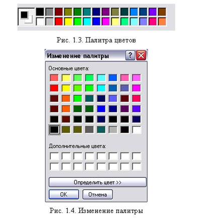 Верхний квадрат – это текущий цвет, т.е. цвет которым рисуем, он выбирается левой кнопкой мыши, а цвет фона (нижний квадрат) – правой кнопкой мыши. Для изменения оттенков цветов зайдем в меню Палитра – Изменить палитру (рис.1.4.)