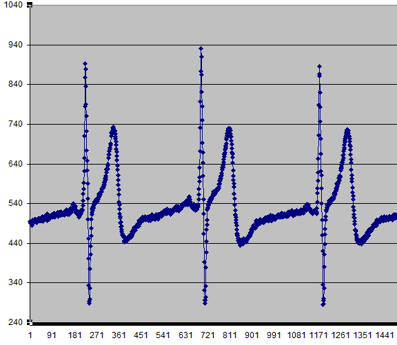 Ну и далее для примера сигнал полученный при помощи данной схемы (электроды размещал на грудной клетке произвольно – как любитель, т.е. не по стандартным медицинским отведениям):