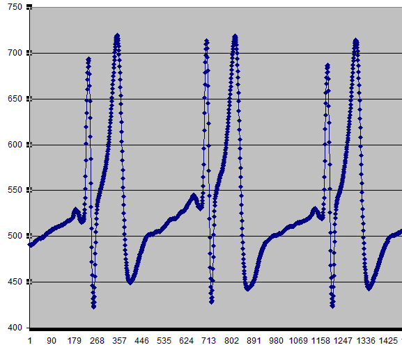 Здесь видно, что система выдаёт сигнал без сглаживания высоких частот. Дальнейшее высокочастотное сглаживание можно организовать программно, а можно аппаратно добавив в схему фильтр нижних частот (ФНЧ) – см. вариант схемы от Андрея на следующй странице. Пример программного сглаживания при помощи простейшего усреднения на основе скользящего окна выглядит так: