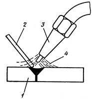 Газовая сварка – сварка плавлением. Сущность процесса газовой сварки заключается в том, что свариваемый и присадочный металлы расплавляются в пламени, получаемом при сгорании горючего газа в смеси с кислородом, развивая температуру в два раза выше температуры плавления металла. При нагревании газосварочным пламенем кромки свариваемых заготовок расплавляются, а зазор между ними заполняется присадочным металлом.
