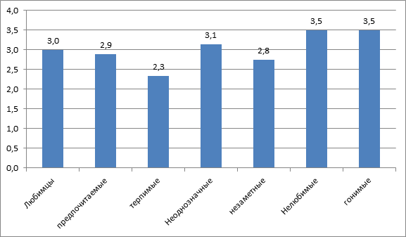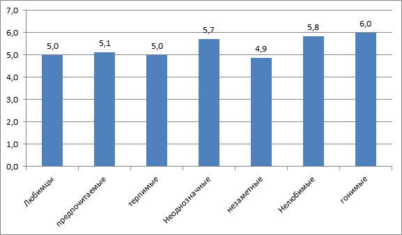 Кадеты — «любимцы» более раздражительны, чем все остальные. «Нелюбимые» чаще проявляют раздражение, чем терпимые», «неоднозначные», «гонимые» и «незаметные». «Незаметные» склонны в самой меньшей степени проявлять раздражение.