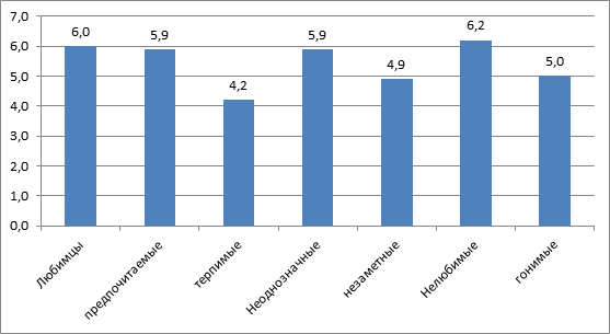 Кадеты — «любимцы» и «предпочитаемые» чаще испытывают угрызения совести, чем все остальные. Менее склонны испытывать чувство вины опять таки склонны «терпимые». Близко друг к другу стоят категории со статусом «неоднозначных» и «нелюбимых», занимающих промежуточное положение.