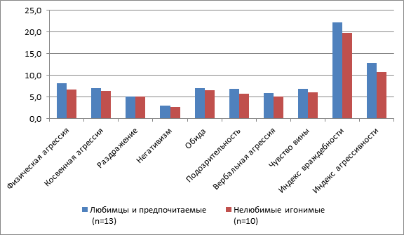 Только у «терпимых» индекс враждебности в пределах нормы. У «незаметных» он на границе нормы. Минимален и близок к норме индекс враждебности у «незаметных». Максимален индекс враждебности у «любимцев» и «предпочитаемых».