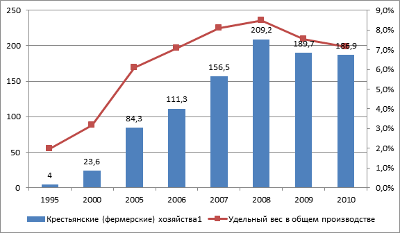 Рис. 1. Динамика производства сельскохозяйственной продукции в крестьянских (фермерских) хозяйствах[1]